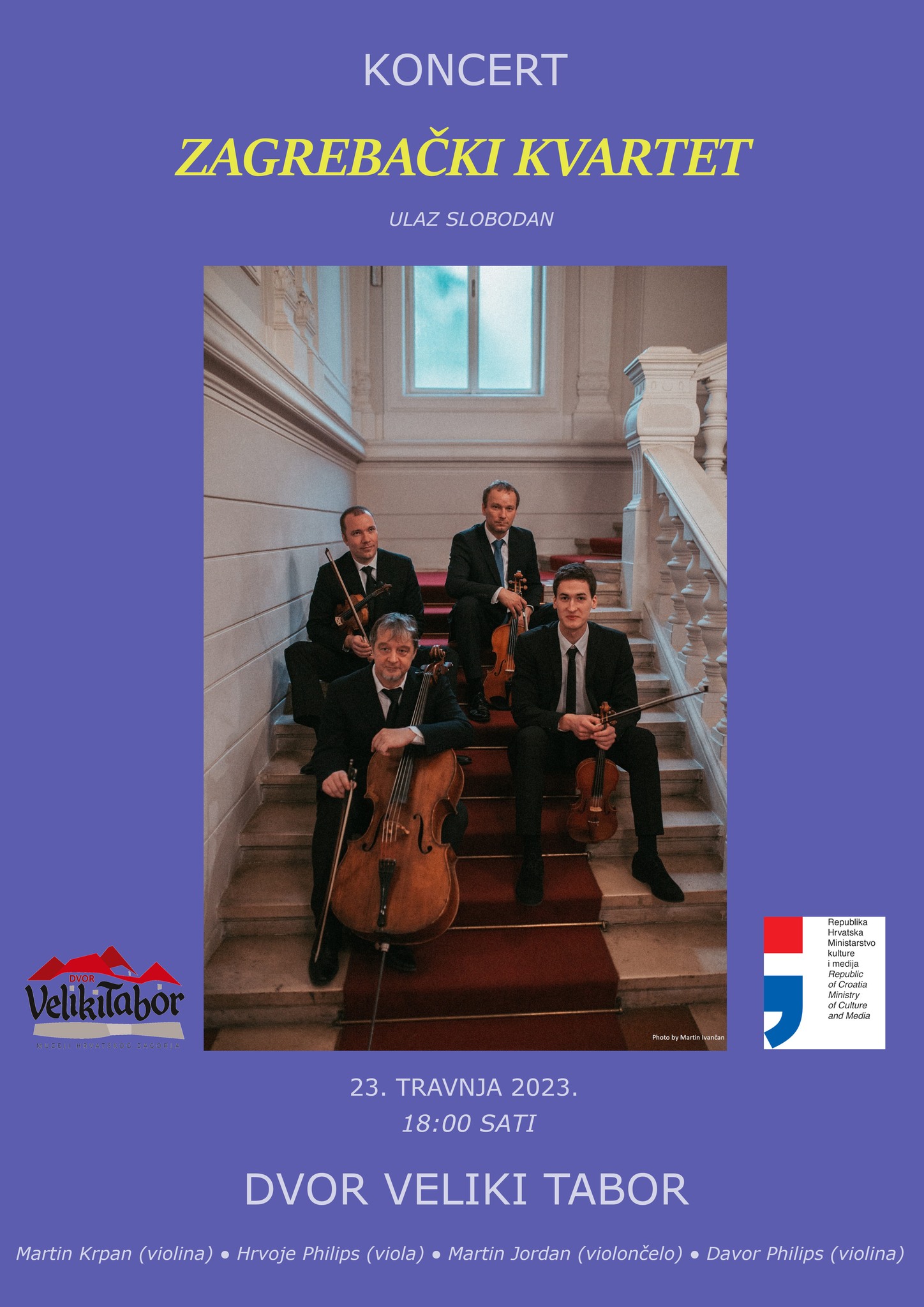 U nedjelju, 23. travnja 2023. godine, s početkom u 18 sati u Dvoru Veliki Tabor održat će se koncert Zagrebačkog kvarteta. Na programu će se naći skladbe Antonína Dvořáka, Antuna Sorkočevića, Jurja Tkalčića i Joaquína Turine.