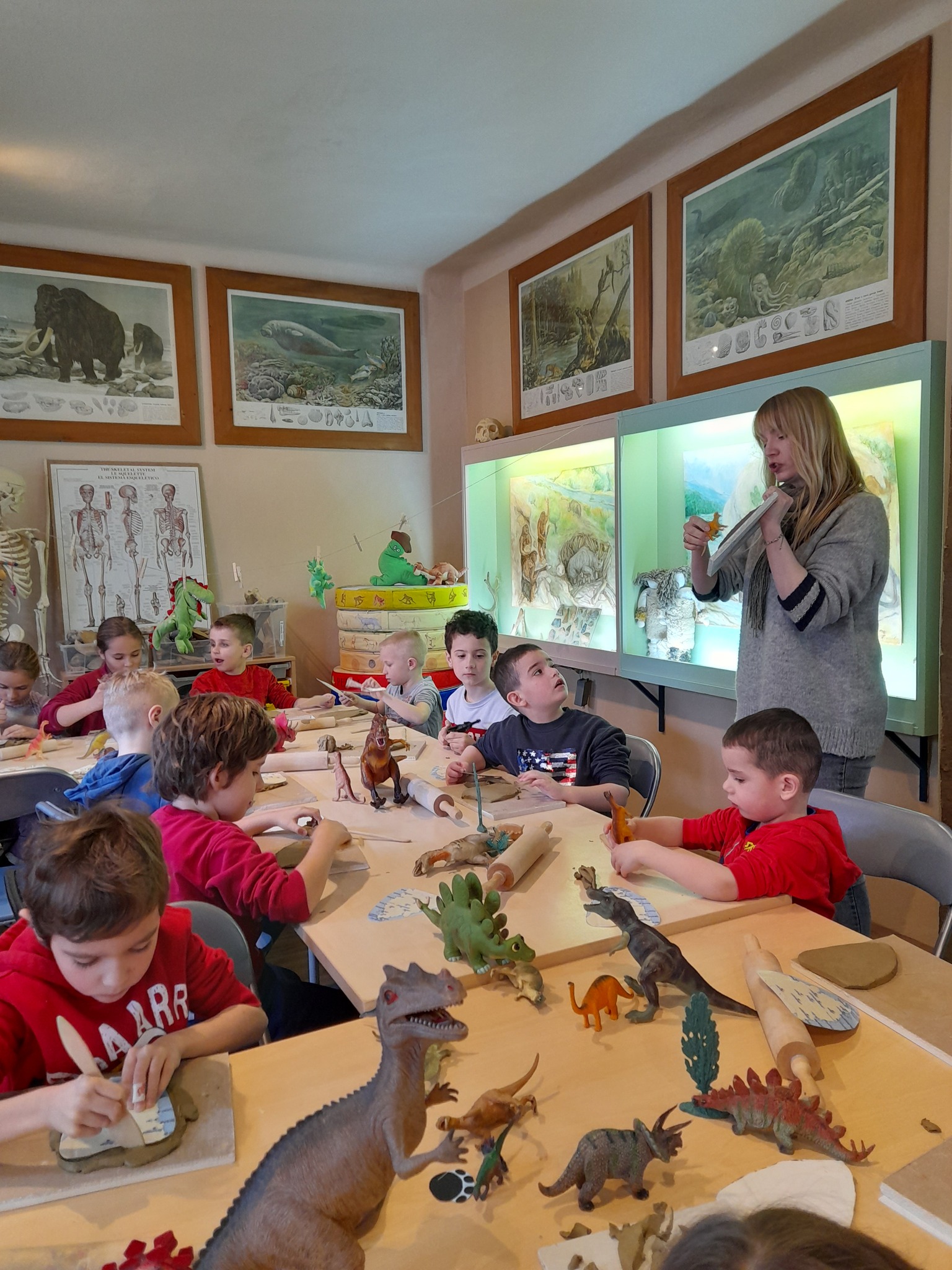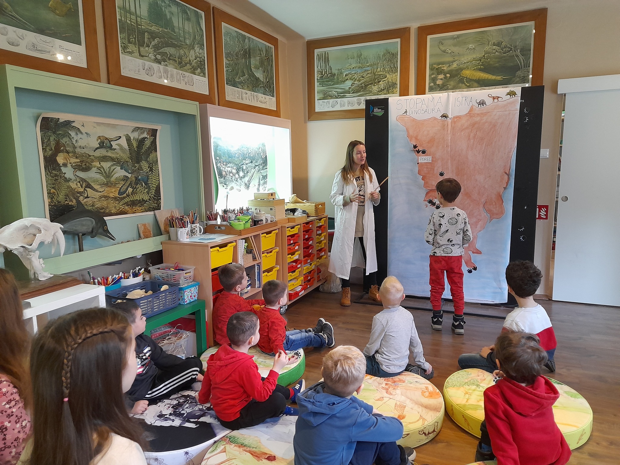 U veseloj atmosferi međusobno su podijelili zanimljivosti koje znaju o tim neobičnim prapovijesnim gmazovima, a zatim su mnogo naučili o stopama dinosaura u Istri. Na velikoj karti su prema uputama paleontologinje označavali mjesta gdje su pronađene stope dinosaura, a uz to su saznali i kako izgledaju stope sauropoda, a kako teropoda, što je dinoturbacija, što su to ihnofosili te što oni otkrivaju. Nakon toga su djeca, kao podsjetnik na naučeno, sama izradila gipsane pločice koje prikazuju Istru sa stopama dinosaura.