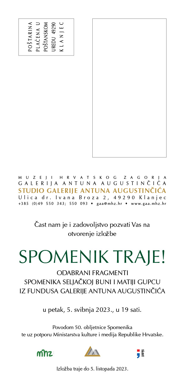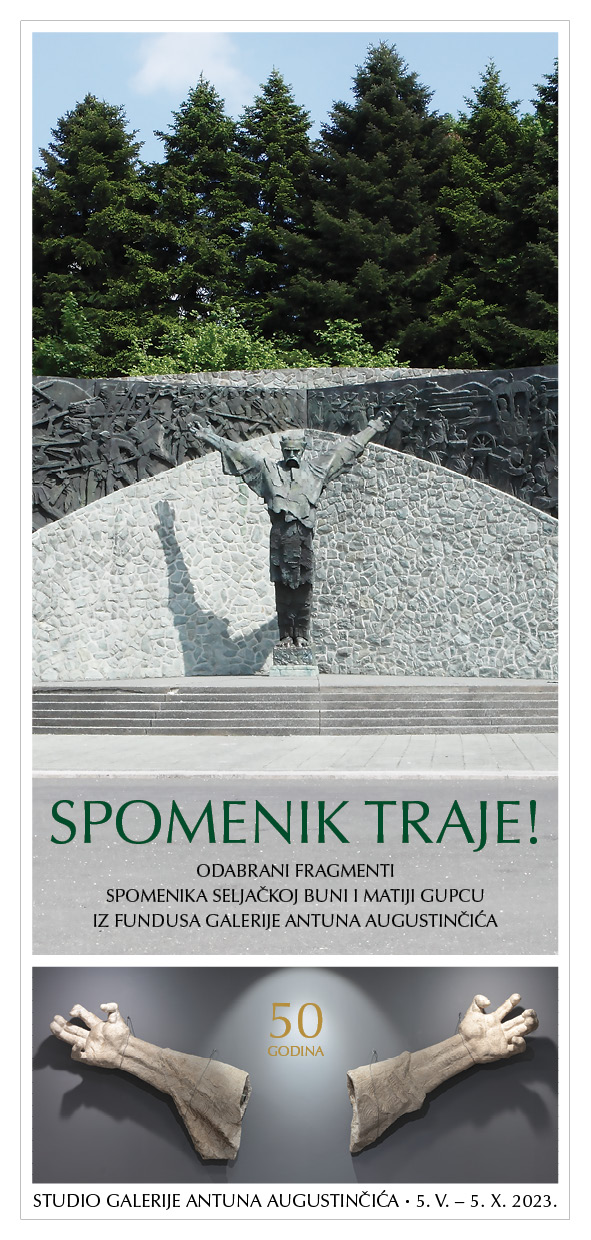 U petak, 5. svibnja 2023. godine, u 19 sati, u Studiju Galerije Antuna Augustinčića u Klanjcu, u Ulici dr. Ivana Broza 2, otvara se izložba SPOMENIK TRAJE! – Odabrani fragmenti Spomenika Seljačkoj buni i Matiji Gupcu iz fundusa Galerije Antuna Augustinčića.