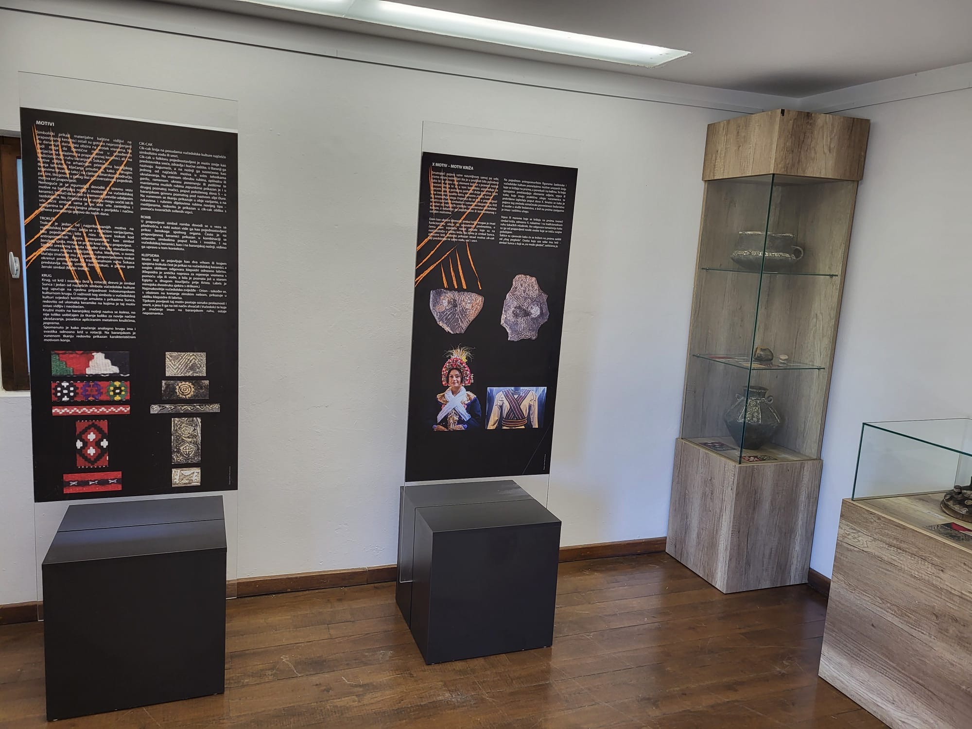 Na njoj posjetitelji mogu vidjeti izložene keramičke predmete kao što su razne antropomorfne keramičke figure, zdjele, modeli peći te autentične primjerke ženskih nošnji s naglaskom na stražnje pregače i plisirane suknje, čime se naglašava kontinuitet kulturnih simbola od prapovijesti do novijeg doba.