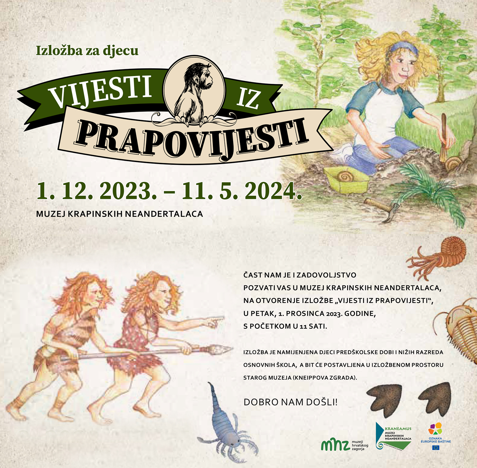 U Muzeju krapinskih neandertalaca je u petak, 1. prosinca, otvorena izložba Vijesti iz prapovijesti, namijenjena djeci predškolske i osnovnoškolske dobi. Toje prva didaktička izložba krapinskoga muzeja namijenjena isključivo djeci te uz obilazak stalnog muzejskog postava predstavlja idealan dodatni sadržaj obiteljima s mlađom djecom koja odluče posjetiti Hušnjakovo.